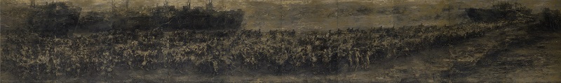 私は中国壁画の表現様式、長幅式の表現様式をとった。最終的に絵を長さ20メートル、高さ3メートルに決めた。絵の高さは、見る人が、場面の外側にいるか、あるいは画面の中に入るかということを左右する。私は皆さんに、この歴史の現場に入りこみ、左から右へ移動しながらみていただきたいのだ。画面の色彩、見る側のリズム、光の配置などを考慮し、特別な手法を使用した。いわゆる科学による光線の配置手法を取らず、私自身の理解した「ホタル」式の光の手法を取った。個々の人物の放つ光を通じて人々が生き残ろうとして現れてきた生命の強さを表現したいと思った。